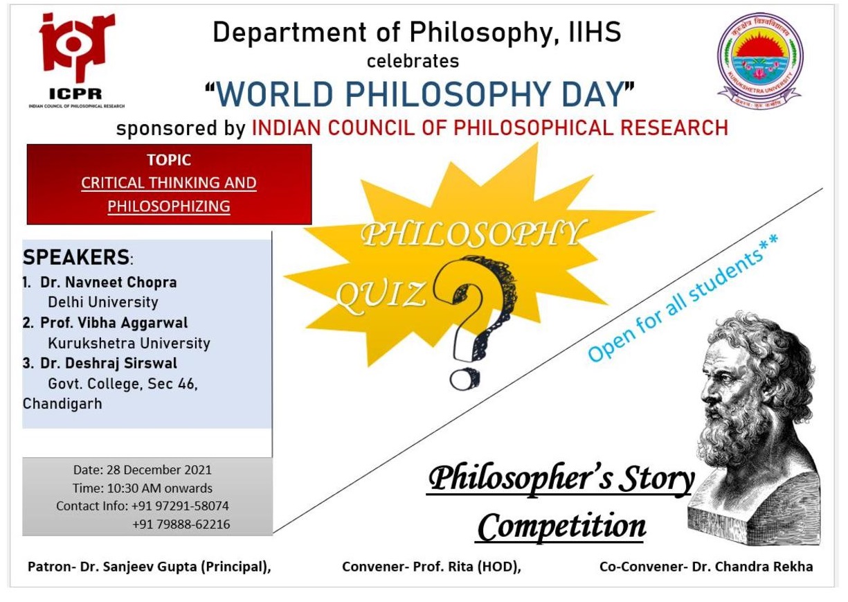 - Delivered Lecture on “Philosophy and the Search of Wisdom” in the World Philosophy Day Celebration by Department of Philosophy , Institute of Integrated and Honours Studies (HISS), Kurukshetra University, Kurukshetra held on 28th December, 2021.
